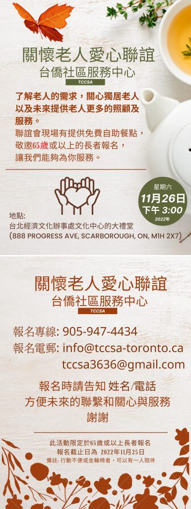 台僑社區活動中心將在2022年11月26日(星期六)舉辦”關懷老人愛心聯誼”活動,邀請65歲或以上的長者參加,大家一起吃飯聊天。 台僑希望能多了解老人的需求,關心獨居老人,也將在未來為老人提供更多的服務。 請大家踴躍報名,謝謝。